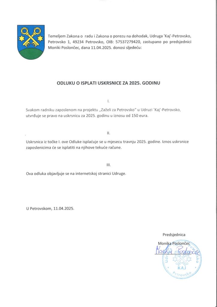 ODLUKA O ISPLATI USKRSNICE ZA 2025. GODINU